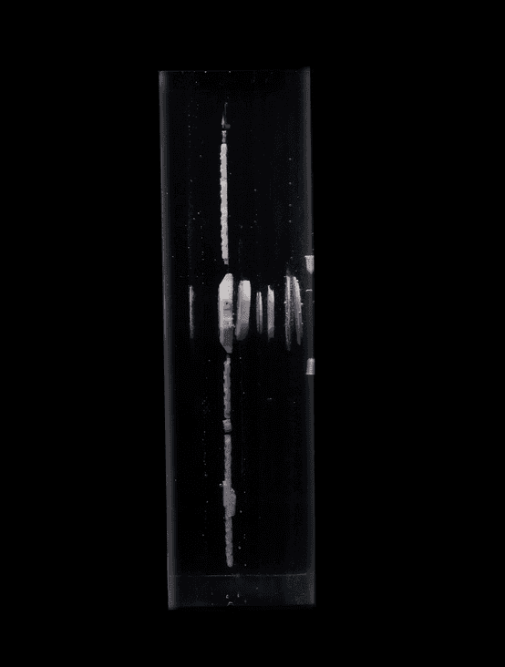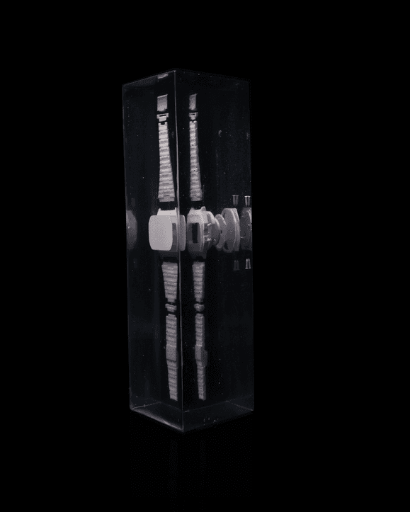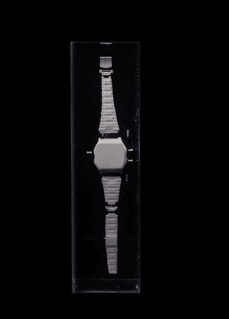 Pieces were cast in resin. Resin was poured and allowed to sit, a piece of the watch was placed with tweezers, after some time the next layer of resin was poured. This process was repeated for several layers.