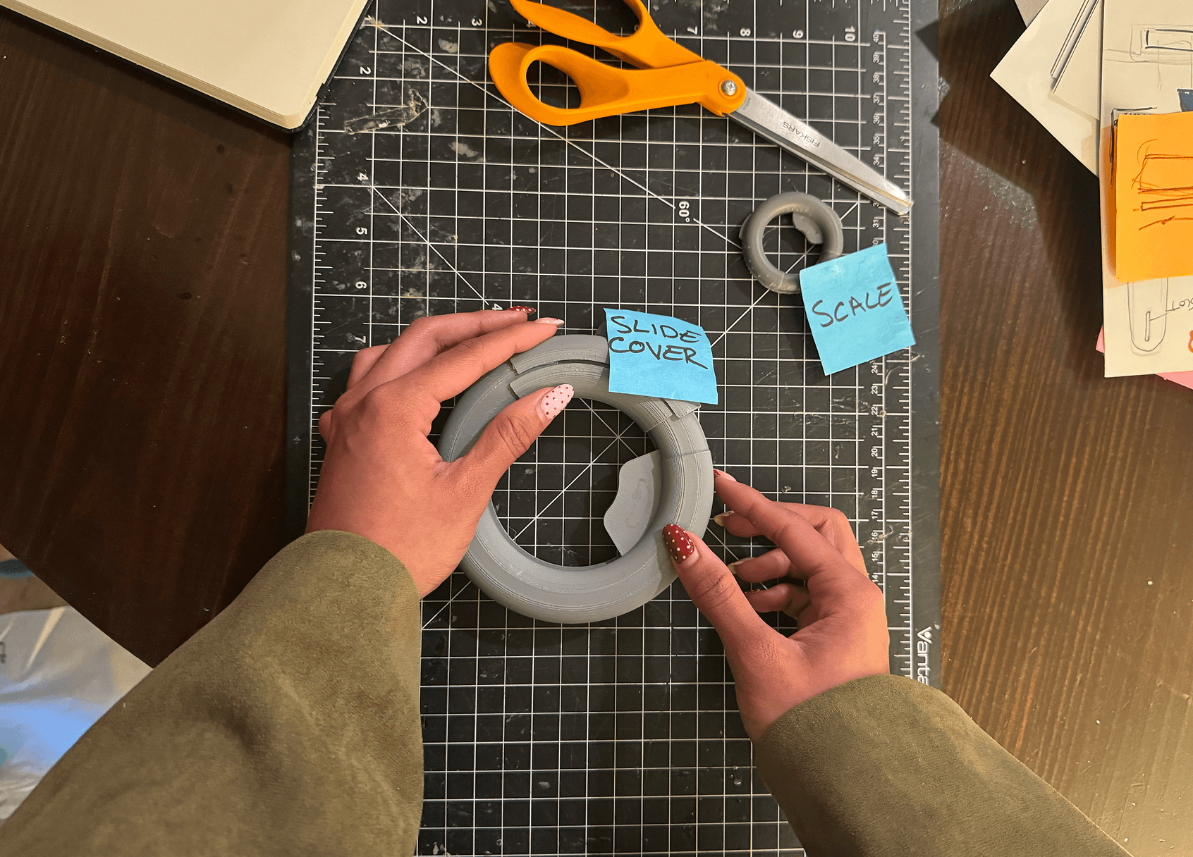 Usability testing of the 3D printed prototype revealed a need to scale up slightly to accommodate for larger hands as well as change button positions and size.